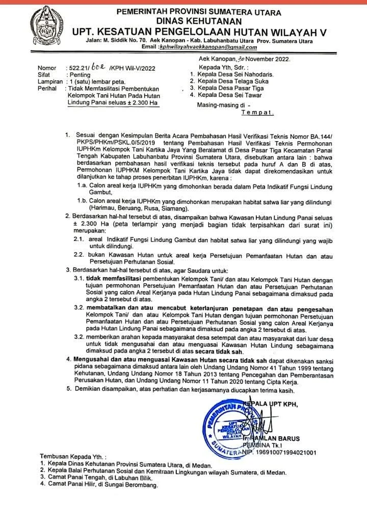 Penegasan itu disampaikan UPT Kesatuan Pengelolaan Hutan (KPH) Wilayah V Aek Kanopan melalui surat resmi kepada empat kepala desa di sekitar kawasan Panai.