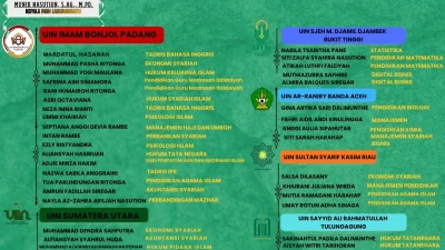 Sementara itu, jalur SPAN-PTKIN memperlihatkan kekuatan lain. Sebanyak 53 siswa tersebar di berbagai perguruan tinggi keagamaan negeri, seperti UIN Sumatera Utara, UIN Imam Bonjol Padang, UIN Ar-Raniry Banda Aceh, hingga UIN Sunan Kalijaga Yogyakarta.